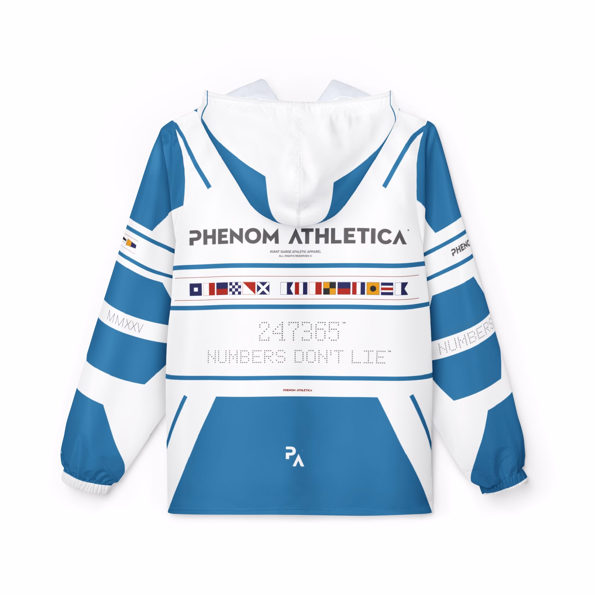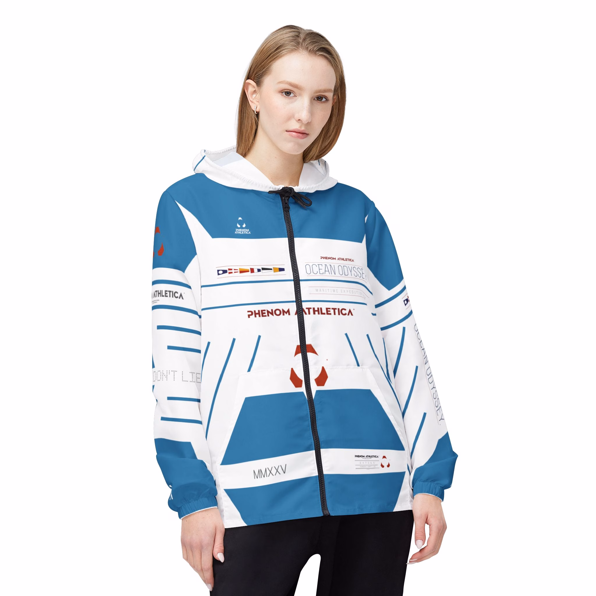 This Phenom Athletica® Ocean Odyssey™ Windbreaker brings Heaps of Aesthetics into any wardrobe. Available in 6 sizes for that Perfect Fit, these jackets are unisex and feature black zippers and strings. Meanwhile, the Two Front Pockets add Extra Practicality Points to what’s already a Daily Staple.
